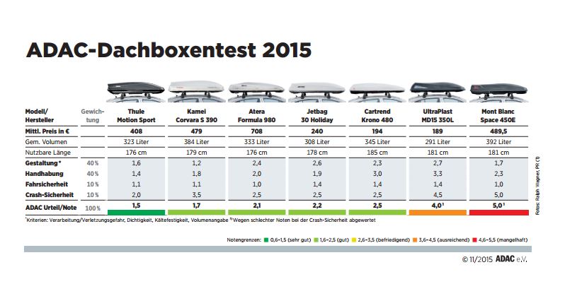Zwei Dachboxen überzeugen nicht im Test: Die UltraPlast MD15 350 L (Note „Ausreichend“) versagte zum Beispiel im Crash-Test. Bei der Mont Blanc Space 450E (Note „Mangelhaft“) sind alle hinteren Befestigungsklauen gebrochen und „die Dachbox trennte sich somit komplett vom Testschlitten.“ Ausführliche Informationen zum Dachboxen-Test des ADAC finden Sie online unter adac.de.